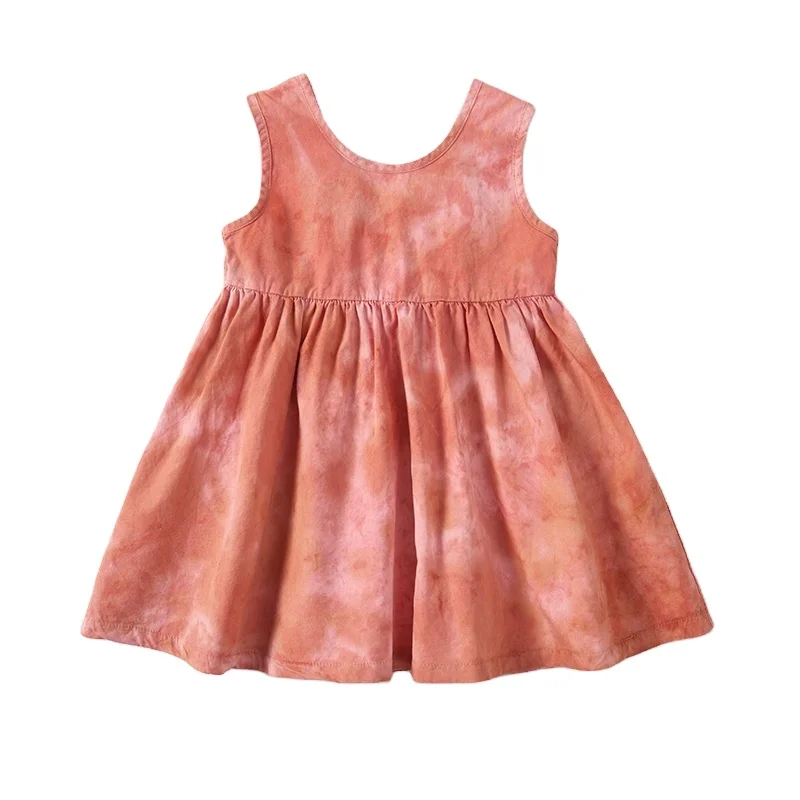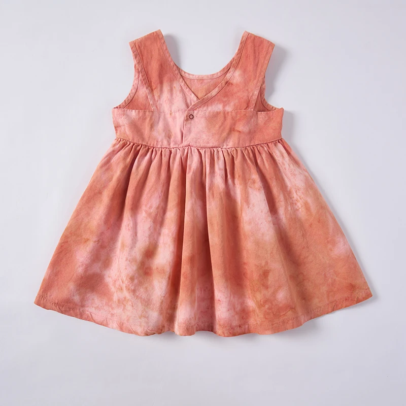 Wholesale Natural Dye Tie Dye Sleeveless Dark Pink Baby Girl Dress Cute Cartoon Pattern Ruffle Plant-Dyed Baby Clothes
